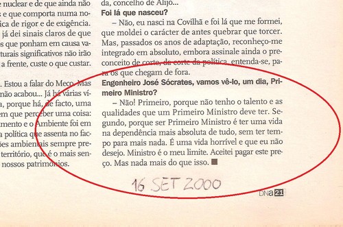 É uma quase desconhecida entrevista do então ministro José Sócrates à revista DNA do Diário de Notícias. Dez anos depois Portugal redescobre a verdade dita pelo próprio José Sócrates. Não tem talento e qualidades para ser Primeiro-Ministro. 16 de Setembro de 2000, uma data que merece mesmo ficar para a história.